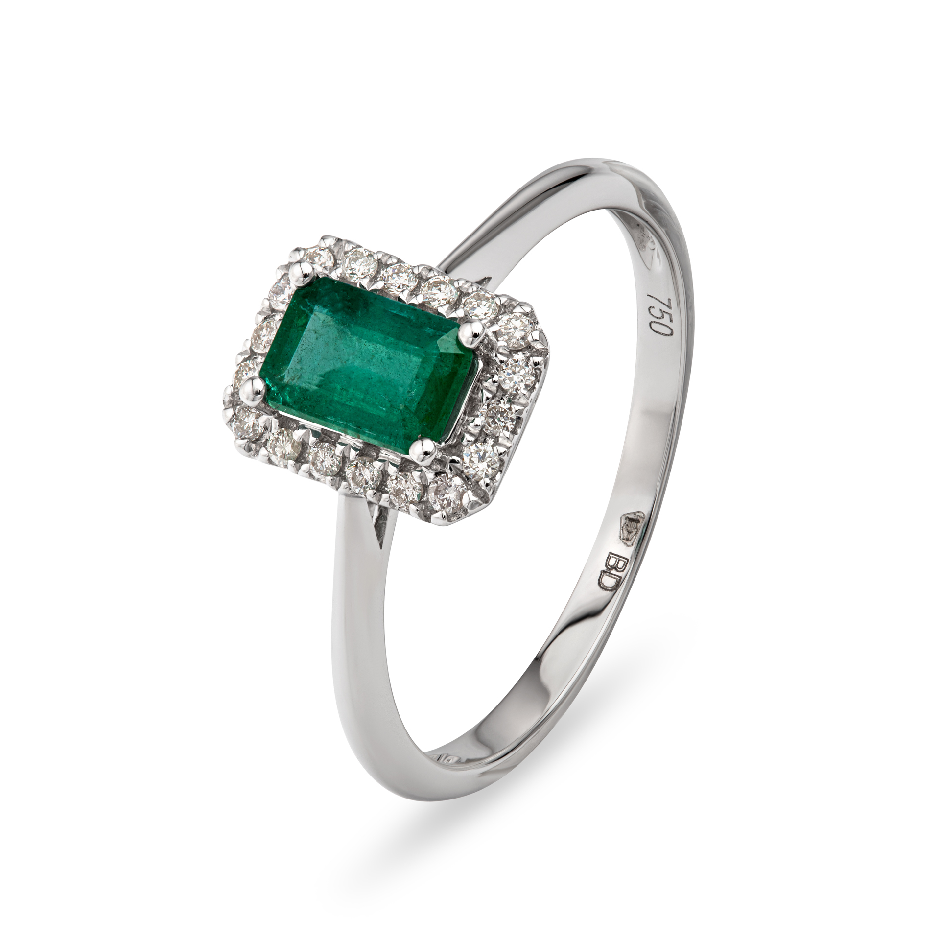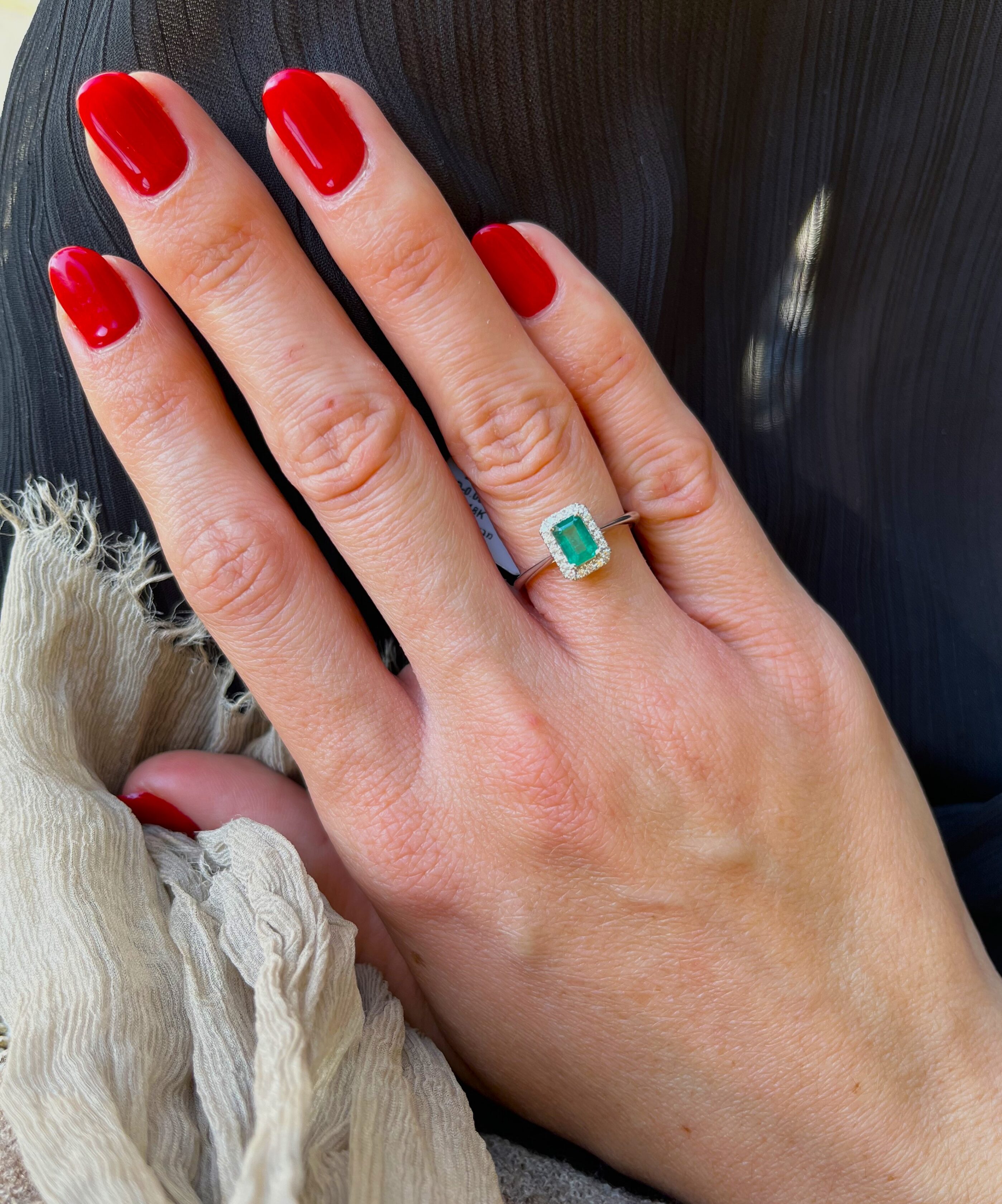 טבעת מזהב 14 קראט משובצת אבן אמרלד מלבנית ויהלומים.