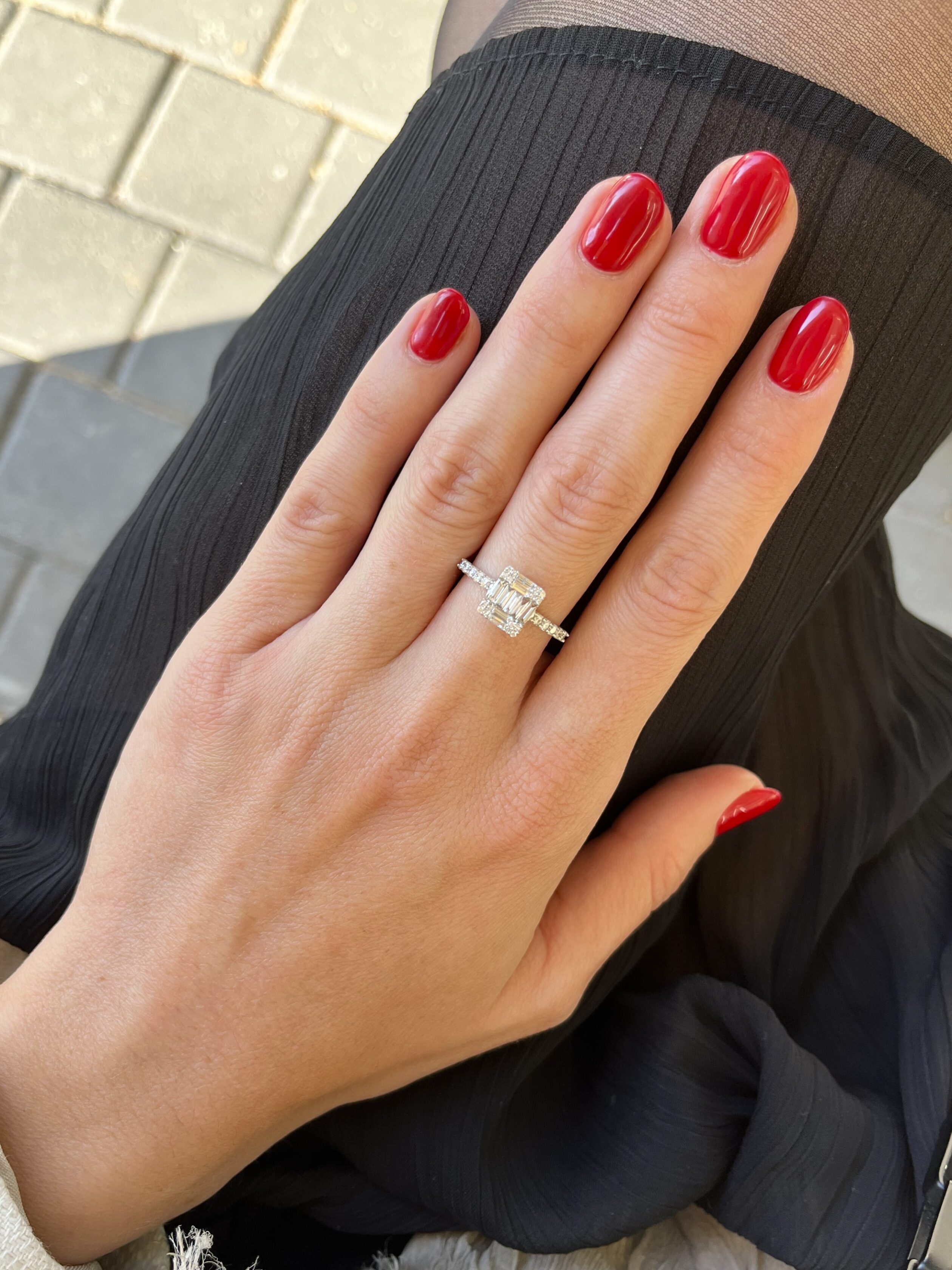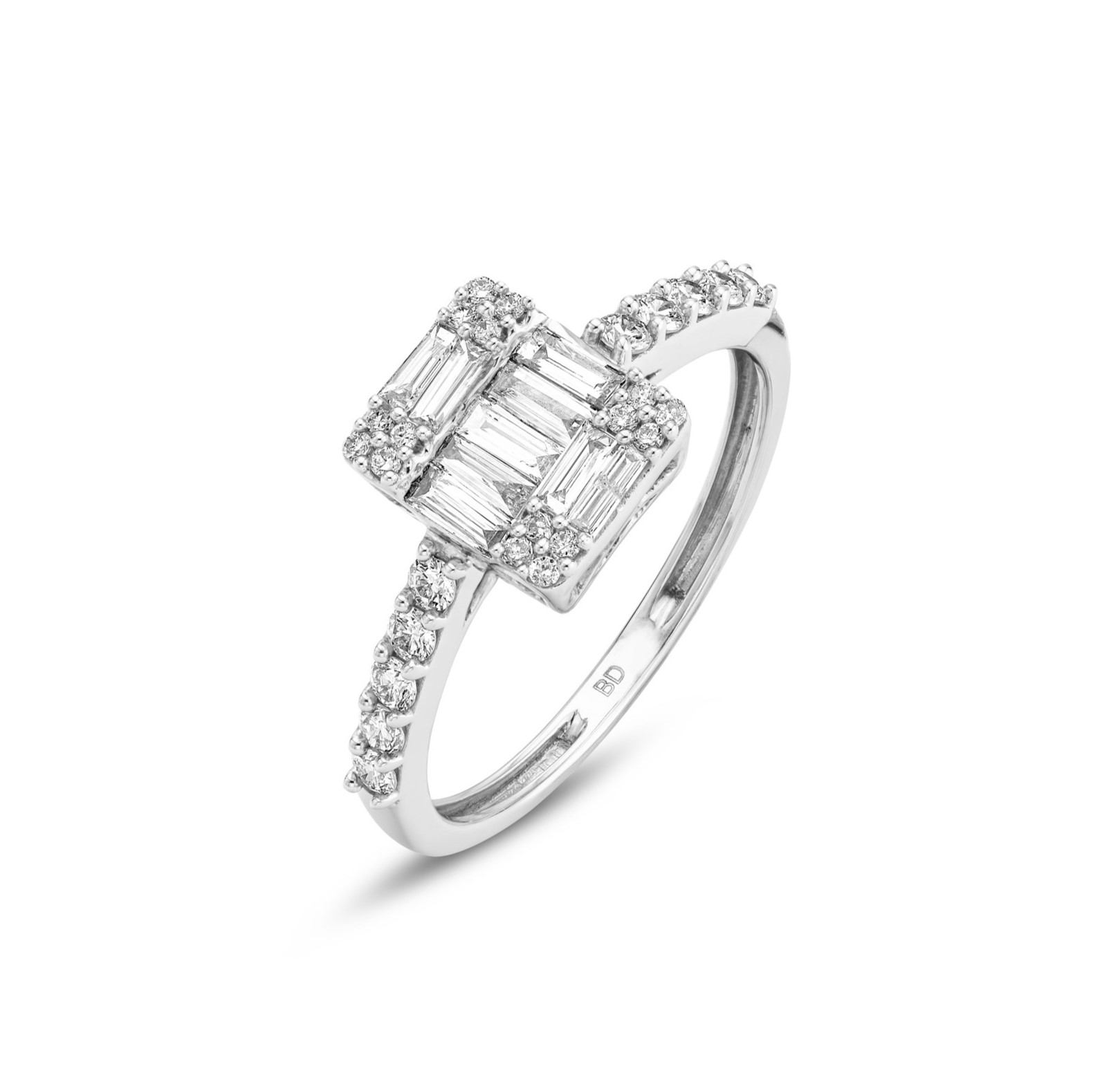 טבעת זהב לבן 18 קראט – יהלומי בגט ויהלומים עגולים