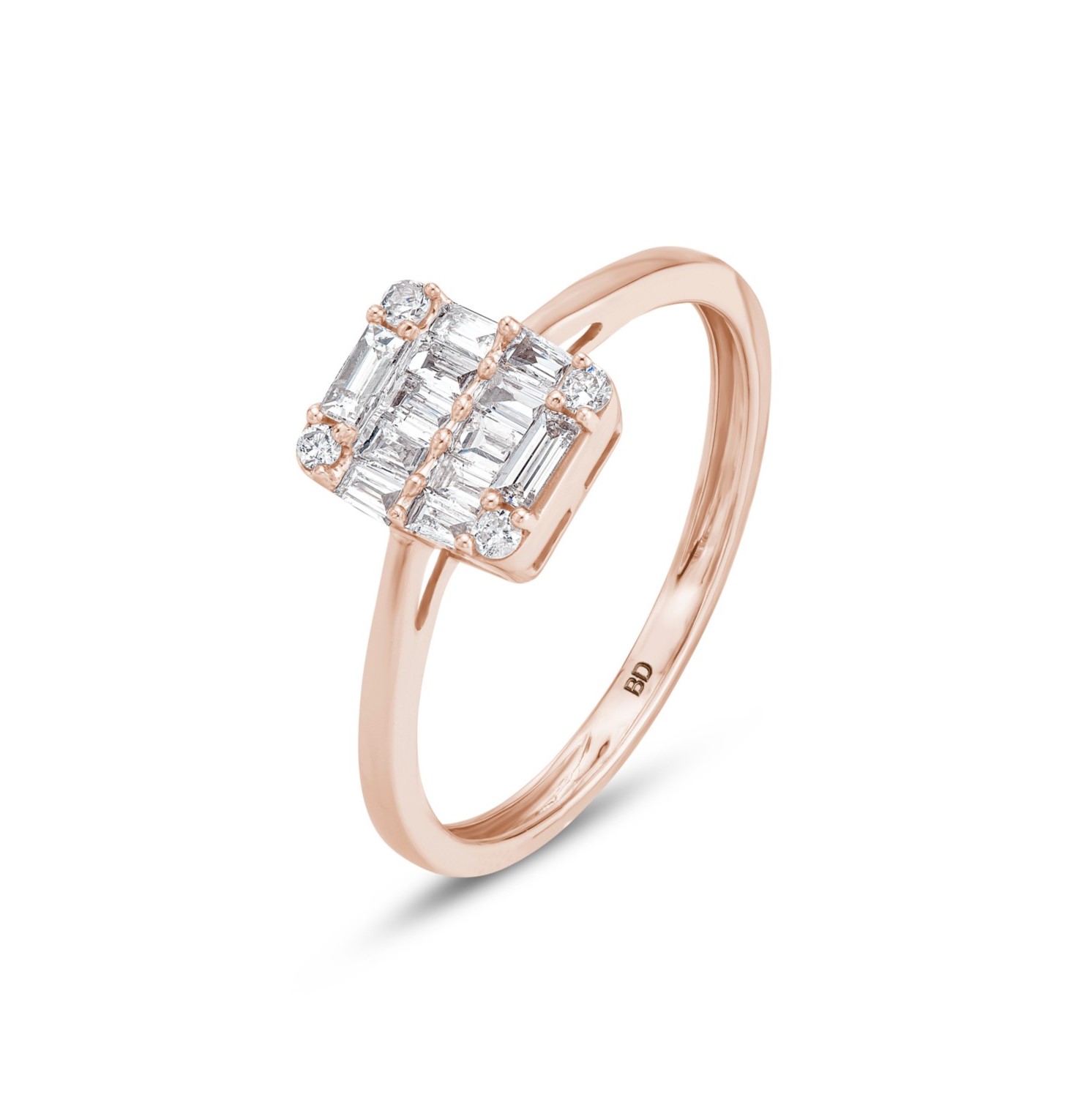 טבעת רוז גולד 18 קראט – יהלומי בגט ויהלומים עגולים