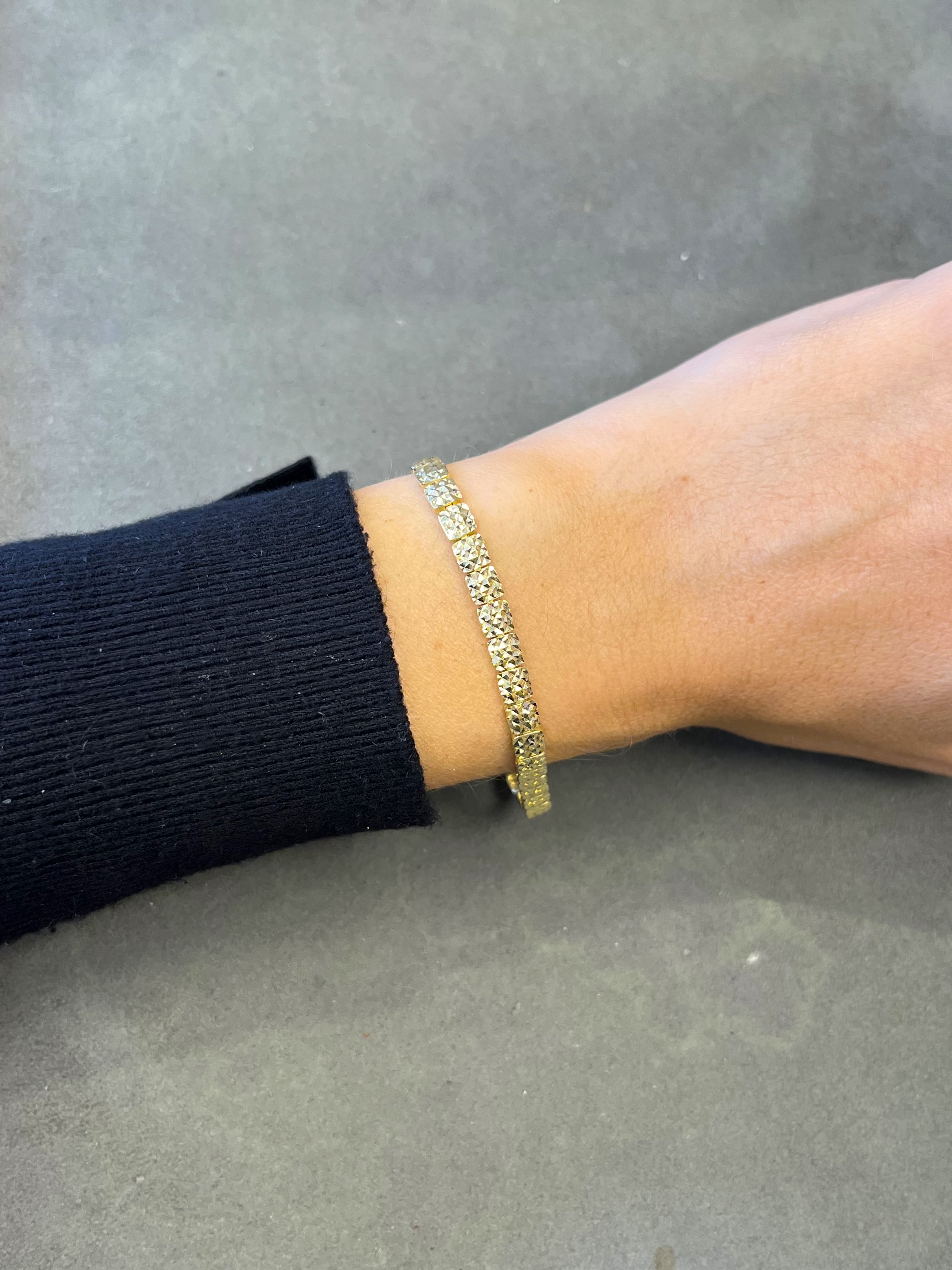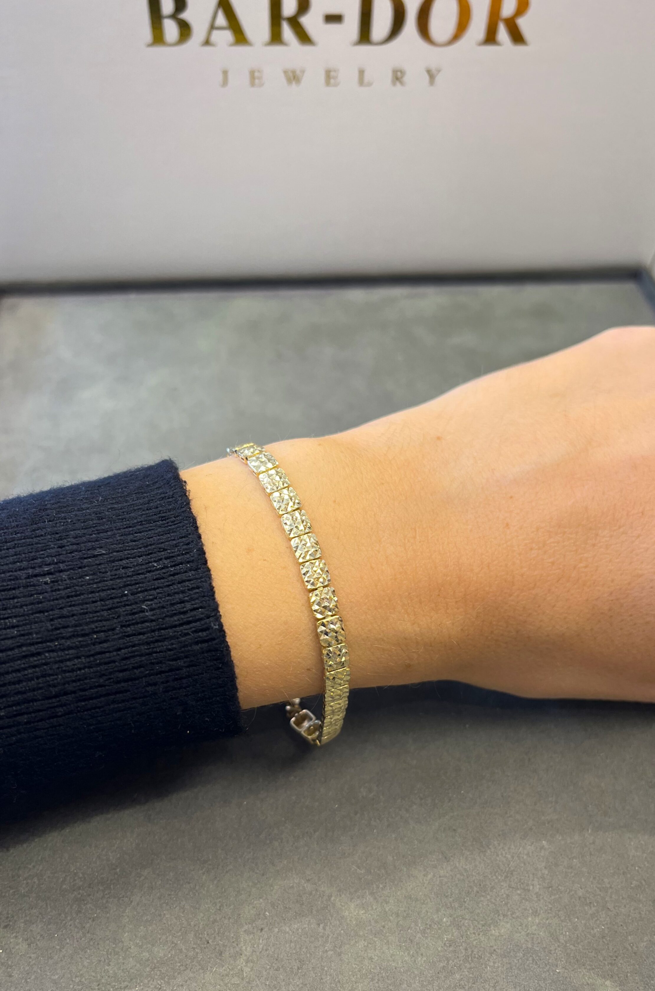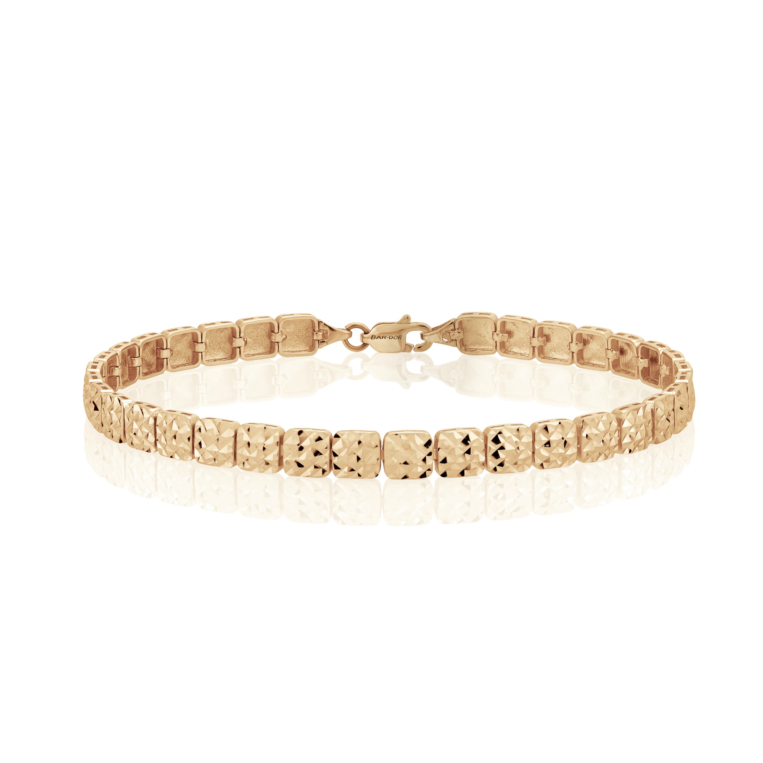 צמיד זהב לאישה בגימור חריטות לייזר מזהב 14 קראט אמיתי, בעל חוליות מרובעות.