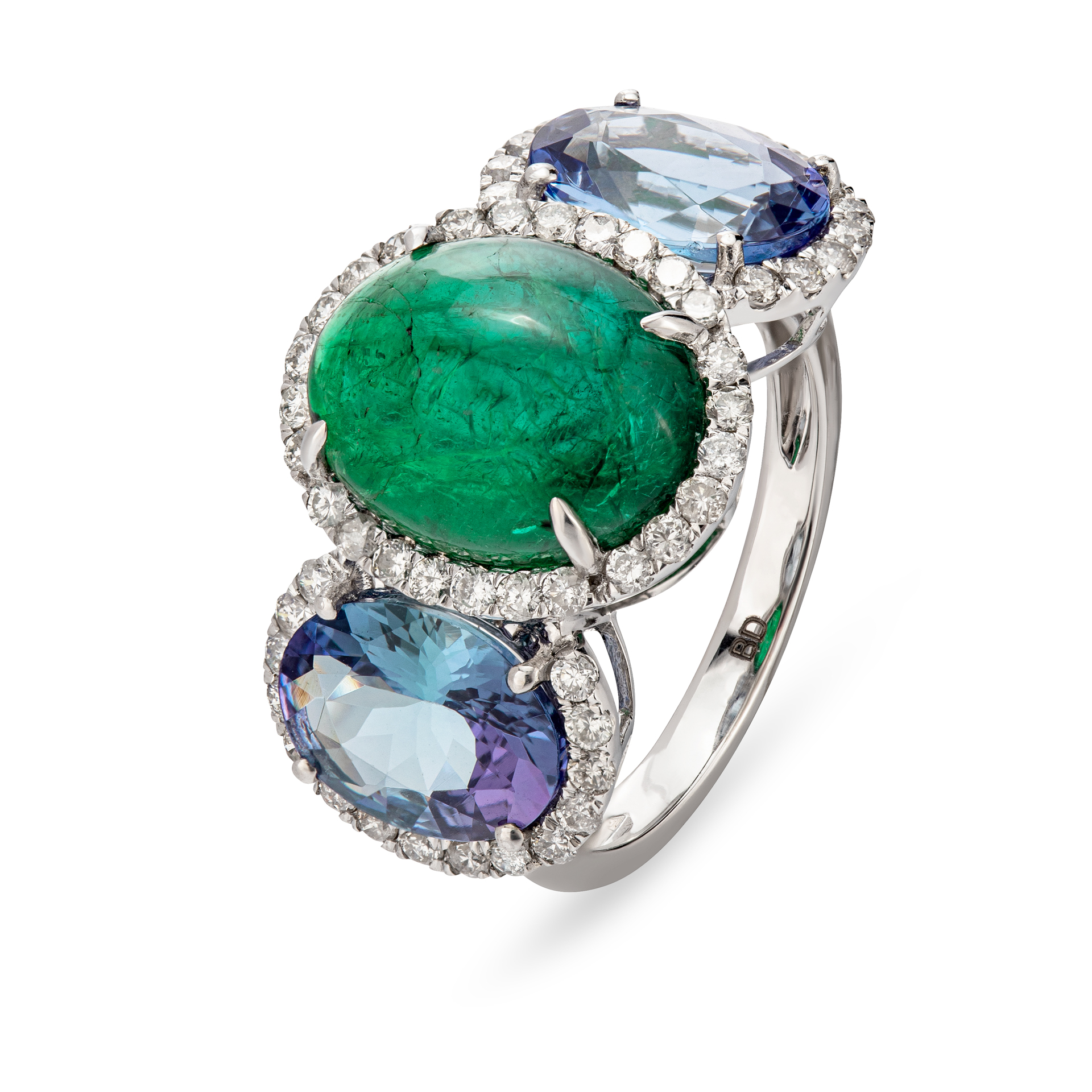 הטבעת עשויה זהב לבן 18 קראט ומשובצת אבן אמרלד בצורת קבושון המיוחדת, שתי אבני טנזנייט (Tanzanite) בעלות צבע מדהים, ויהלומים קטנים המקיפים אותם.