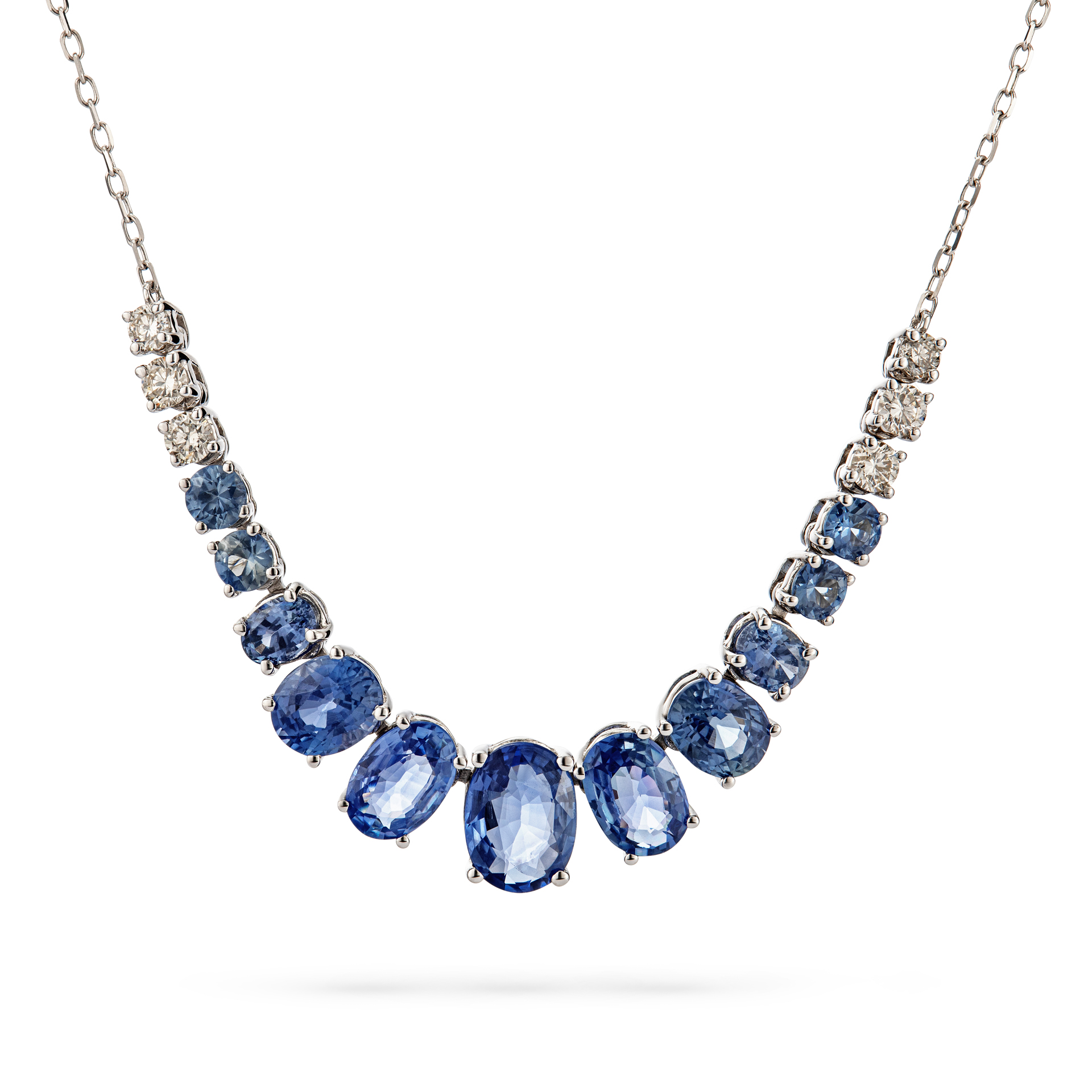 השרשרת משלבת אבני ספיר טבעיות כחולות בצורת אליפסה (Oval), במשקל 3.82 קראט, ויהלומים טבעיים.