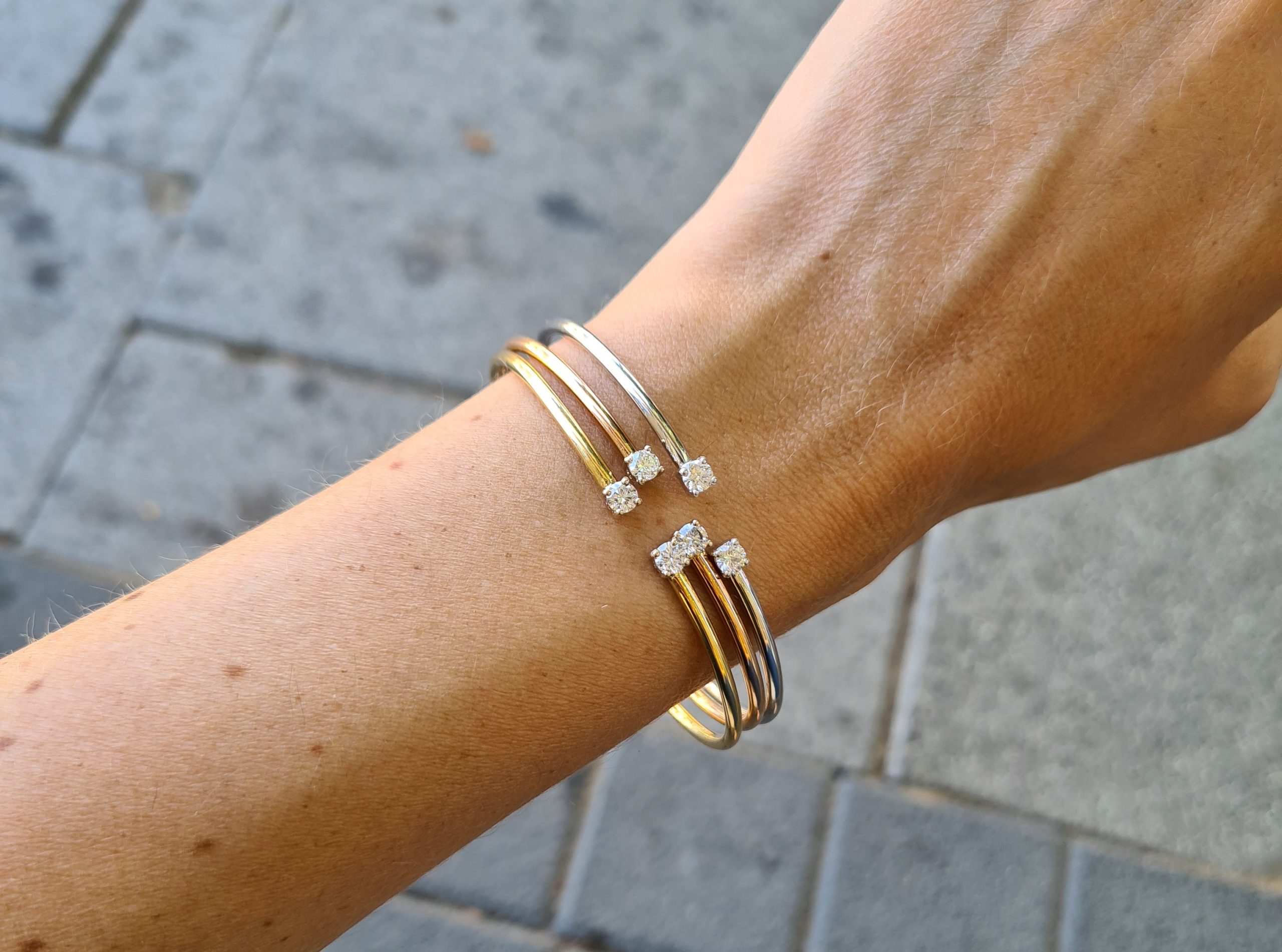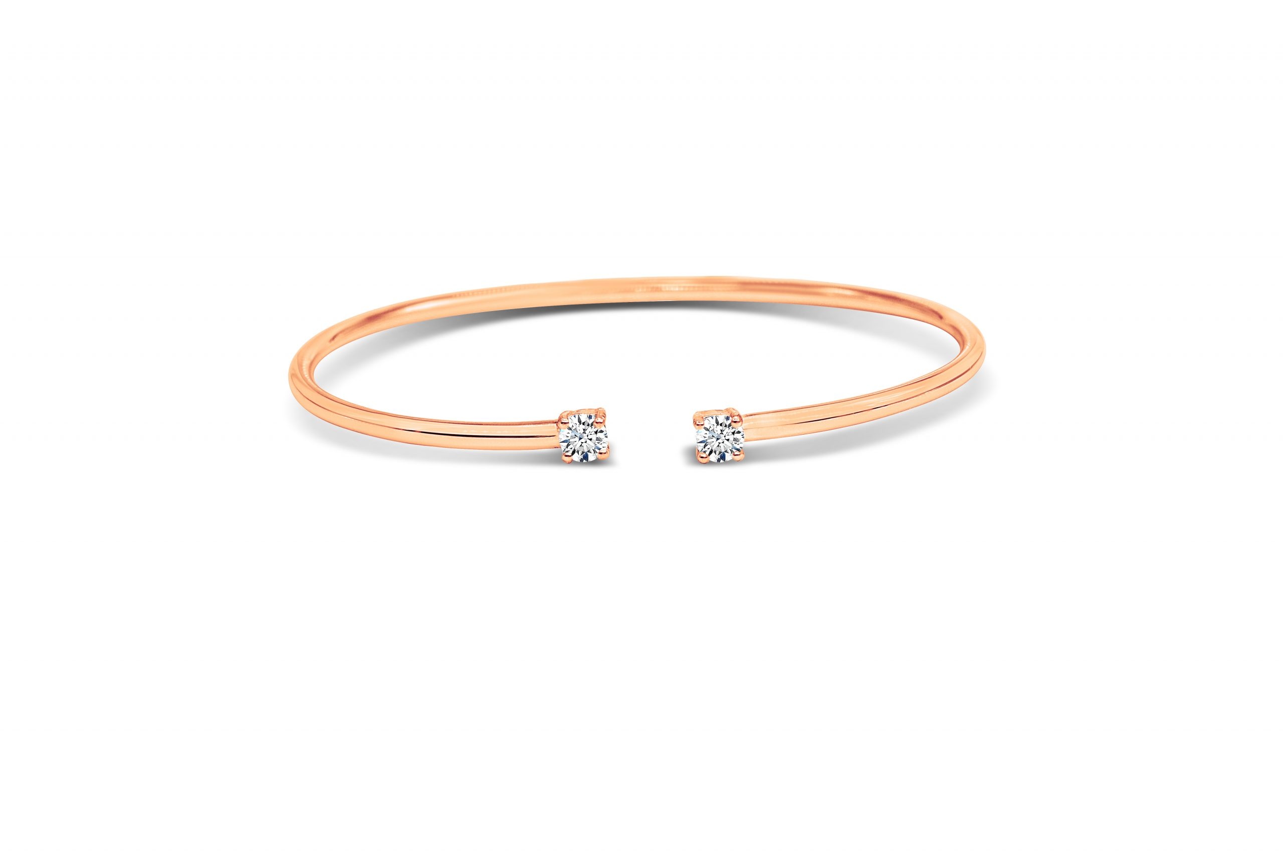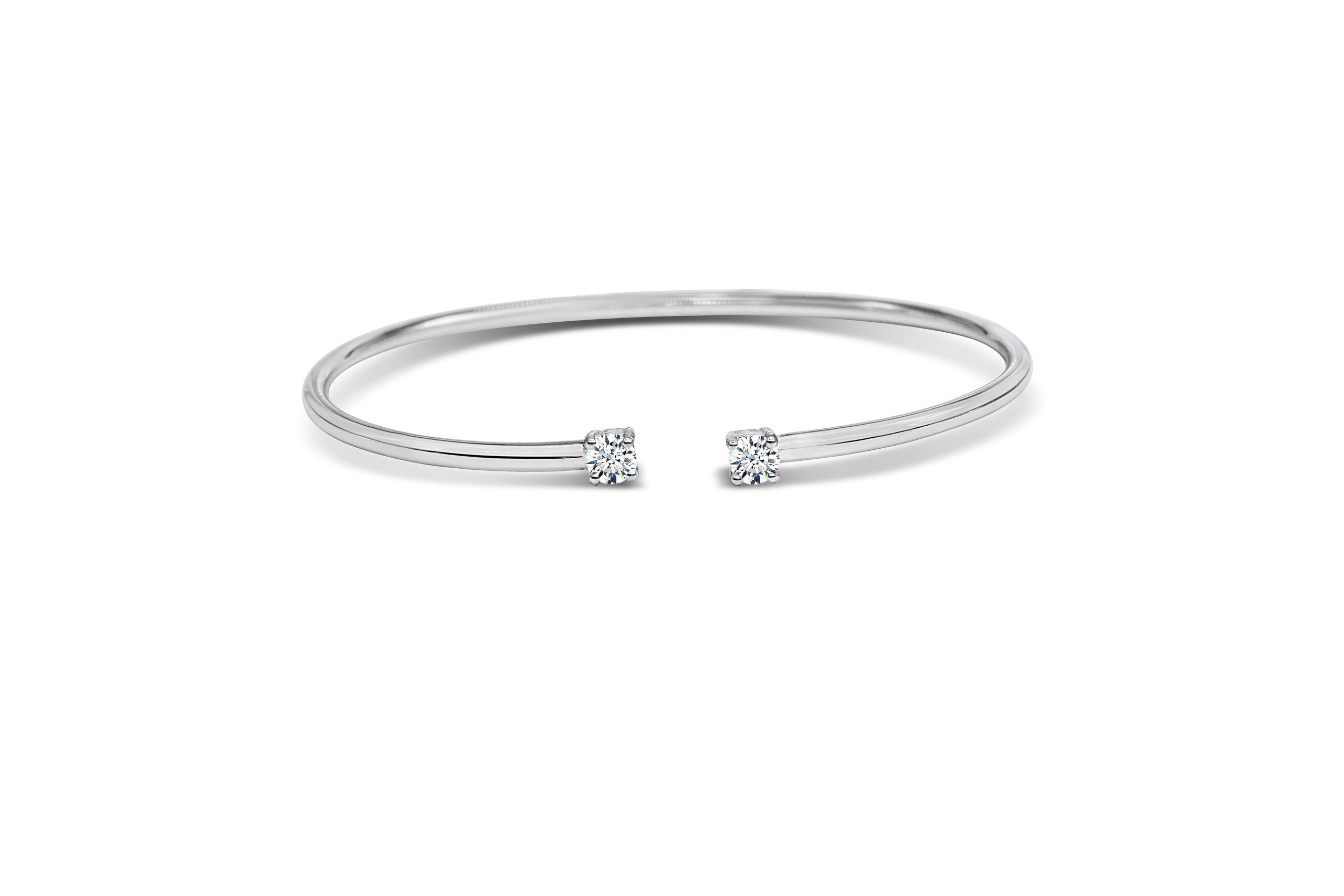 צמיד "בנגל" (קשיח) מדהים, משובץ שני יהלומים טבעיים ומנצנצים – מזהב לבן 14 קראט