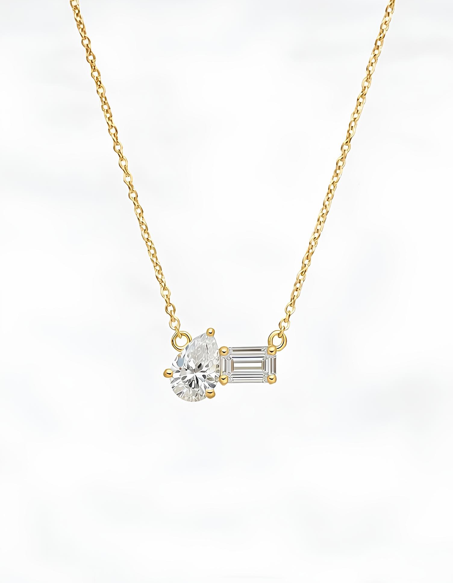 שרשרת זו מביאה לידי ביטוי את היופי שבניגודים, עם שני יהלומי מעבדה מרהיבים בשיבוץ אסימטרי מוקפד: יהלום בחיתוך Pear (טיפה) המעניק רכות וזרימה, לצד יהלום בחיתוך Emerald (אמרלד) המשדר עוצמה וניקיון גיאומטרי.
